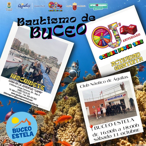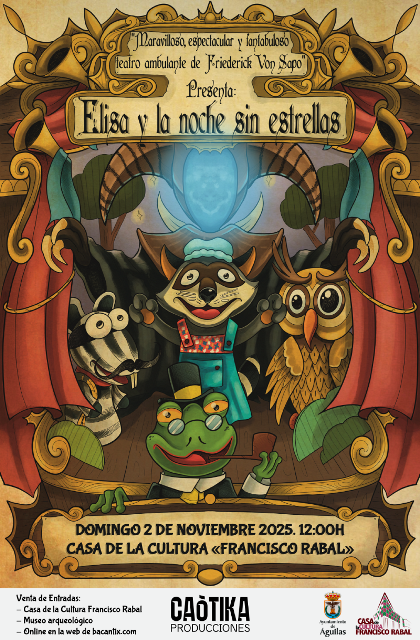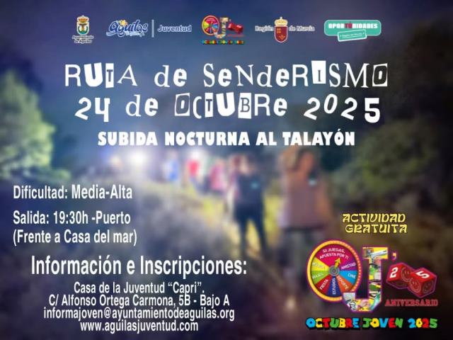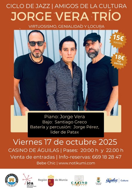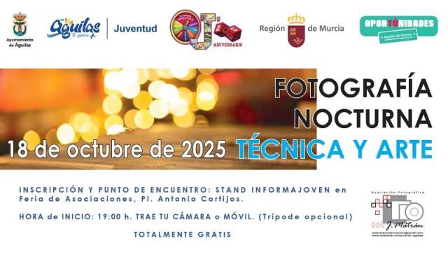 LISTADO DE EVENTOS PULSA SOBRE UN EVENTO PARA OBTENER MÁS INFORMACIÓN 17/10/2025 JORGE VERA TRÍO ... 17/10/2025 TANGO SHOW... 18/10/2025 PRESENTACIÓN LIBRO... 18/10/2025 BAUTISMO DE MAR ... 18/10/2025 TALLER DE FOTOGRAFÍA NOCTURNA ... 19/10/2025 MERCADO DE OTOÑO ... 19/10/2025 FOTOMARATÓN "ÁGUILAS SE VE"... 19/10/2025 LA TRAVIATA... 24/10/2025 SUBIDA NOCTURNA AL TALAYÓN... 25/10/2025 FUNDAMENTOS BÁSICOS DE LA FOTOGRAFÍA DE ESTUD... 25/10/2025 TRAVESÍA EN KAYAK... 25/10/2025 XXI CERTAMEN DE TEATRO AFICIONADO ... 25/10/2025 SERVICIO DE HABITACIONES... 30/10/2025 Gala Benéfica ASTEAMUR... 31/10/2025 OCTUBRE JOVEN 2025... 01/11/2025 Amigas Desgraciadas... 02/11/2025 ELISA Y LA NOCHE SIN ESTRELLAS ... 02/11/2025 ELISA Y LA NOCHE SIN ESTRELLAS... 07/11/2025 "Entre Cuerdas y Metales " Orquesta Sinfónica... 08/11/2025 No te vistas para cenar... 13/11/2025 EL MONAGUILLO: Efectivi-Wonder... 15/11/2025 Tal vez soñar...